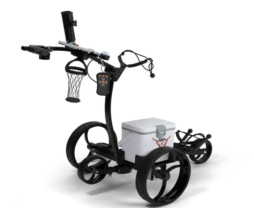 - Super E Caddy is a golf cart powered by a rechargeable lithium-ion battery. With just one charge, the battery can last for 33 holes. The cart features a versatile remote control with adjustable speeds, making it incredibly user-friendly. Additionally, it includes a convenient button for forward and backward movements. In case the battery runs out, the cart can easily switch to freewheel mode by unlocking the wheels. The Super E Caddy offers the flexibility of being used as both a push cart and an electric cart.